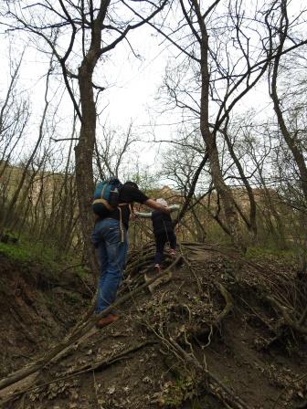 Am ajuns la un punct mai drept și ne-am așezat pentru a ne odihni și am decis ca doar eu și Victor să urcăm mai departe, dar pe rând. Prima dată a urcat Victor, dar nu s-a dus foarte mult în sus, iar coborârea a făcut-o aproape pe fund așa abrupt a devenit drumul. Cât l-am așteptat, Ruxy s-a jucat cu niște viermi negri care mișunau pe jos în timp ce eu o țineam cu o mână și cu cealaltă mă chinuiam să mai fac fotografii. Când s-a întors Victor a fost rândul meu să urc. Eu am urcat până la un vârf cu o piatră mare în vârf. Posibil să se poată merge pe lângă acea piatră pentru că am văzut o cărare mică, dar faptul că erau prăpăstii pe ambele părți m-a făcut să mă opresc și să mă întorc considerând că am văzut suficient. Deci am făcut bine că am urcat pe rând pentru că acea porțiune clar nu este pentru copii.