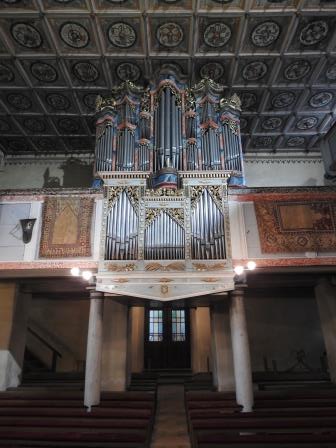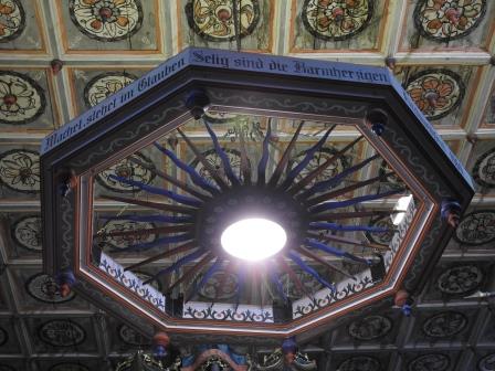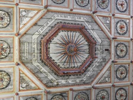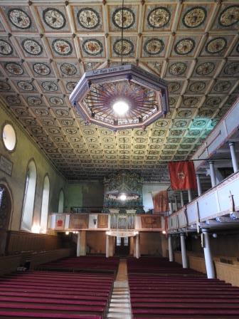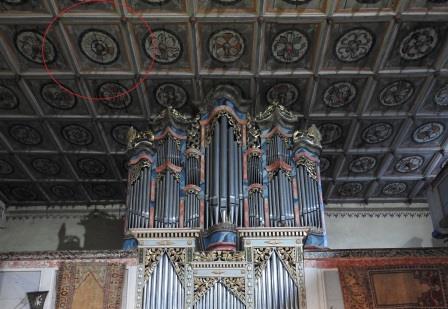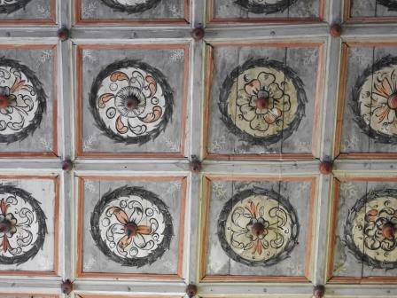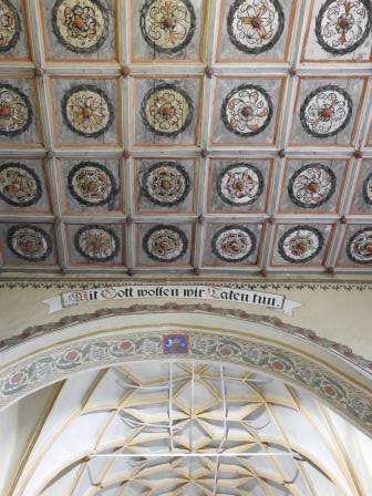 Tavanul bisericii este cel mai frumos tavan casetat pe care l-am văzut eu până acum. Pictate în stil renascentist în 1702 de către Johannes Stolz, cele 252 de casete de lemn reprezintă o reprezentare grafică diferită a trandafirului lui Martin Luther (Lutherrose). Două casete ar fi însă diferite: una în care este vizibilă o figură umană reprezentând un autoportret al pictorului și una cum te uiți în partea stângă a orgii care reprezintă un fel de ceas (marcat cu cerc roșu într-o fotografie mai jos). Fiecare casetă prezintă în mijloc un fel de fus de lemn orientat în jos. În mijlocul tavanului casetat se află un medalion octogonal cu dimensiunea de 3casete x 4casete unde este înscripționat anul și autorul picturii și anul renovării (Renovatum 1959). Restaurarea picturii tavanului din anul 1959 a fost realizată de către Eduard Morres.