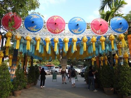 Ne-am cazat în sfârșit la hotel și am cerut indicații cum să ajungem la Piața de Duminică (Sunday Market) despre care citisem în prealabil și planificasem excursia astfel încât să ajungem duminica în Chiang Mai tocmai ca să participăm la acest târg. Pentru ca târgul respectiv să aibă loc, poliția a oprit circulația mașinilor pe câteva străzi, comercianții desfășurându-și tarabele pe stradă. Târgul era plin de turiști și găseai orice îți doreai: de la mâncare, la suveniruri, la canvasuri de pus pe perete, genți, tricouri, etc. Un târg foarte comercial și nu prea tradițional, dar care ne-a plăcut foarte mult. Victor chiar a putut să mănânce din nou street food cu specific tailandez după ce în Bangkok nu a putut face acest lucru. Am cumpărat câteva suveniruri de aici atât pentru noi cât și pentru familie și prieteni.