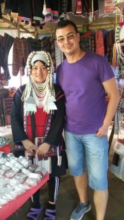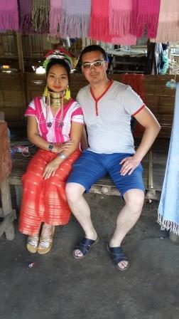 După ce am coborât de pe elefant a urmat vizita la un sat “tradițional” al tribului Long-neck. Am fost foarte dezamăgiți. De fapt sunt câteva tarabe unde niște femei din tribul respectiv vând produse și stau ca la expoziție să se uite turiștii la ele. I-am făcut lui Victor poză cu o fată după ce i-am cerut permisiunea și i-am dat și bani că ne-a lăsat să o fotografiem. Li se spune long-neck pentru că femeile din tribul respectiv își alungesc gâtul cu ajutorul unor inele. Obiceiul începe de mici copii numărul de inele crescând cu înaintarea în vârstă.