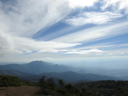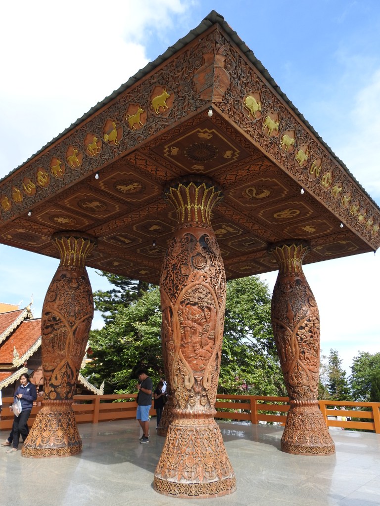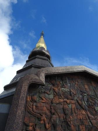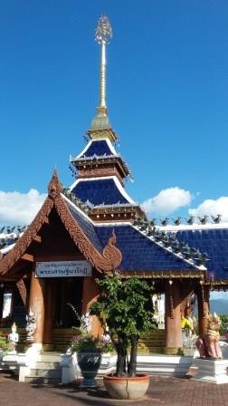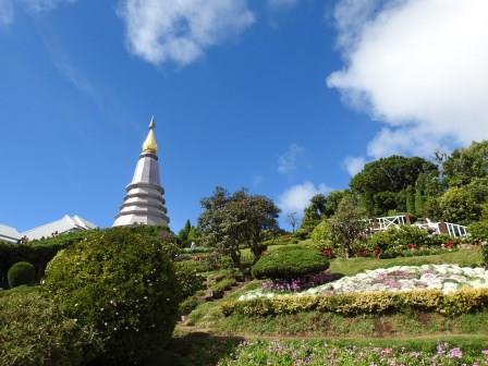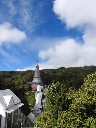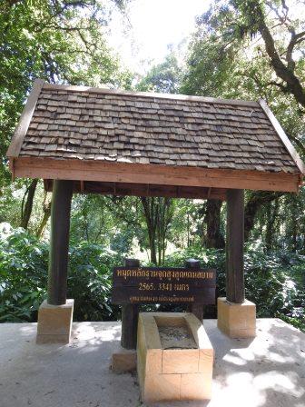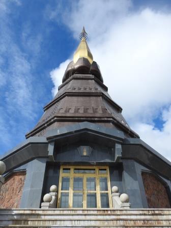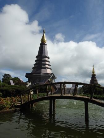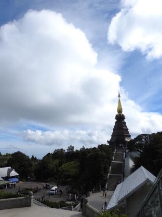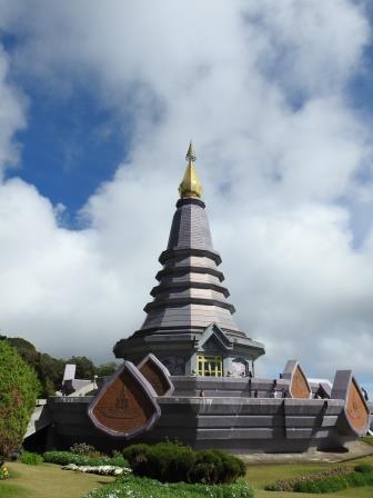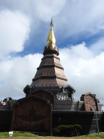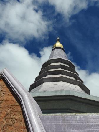 Ne-am continuat drumul spre Doi Inthanon care, la cei 2565m înălțime, este cel mai înalt munte al Tailandei. Muntele a fost redenumit așa în cinstea ultimului rege din Chiang Mai, Inthawichayanon, rege care a fost preocupat de păstrarea pădurilor din nordul Tailandei și care acum este înmormântat pe munte. Trecând pe lângă mormântul regelui, ghidul nostru s-a închinat și a rostit o rugăciune. Am fost avertizați cu privire la posibile temperaturi scăzute când vom ajunge în acest punct al excursiei (s-au înregistrat și -5 grade Celsius) motiv pentru care ne-am luat gecile cu noi. Noi nu am fost nevoiți să le folosim, dar ghidul, spre amuzamentul nostru, era înfofolit. Până la plăcuța pe care este trecută altitudinea maximă se merge prin junglă pe un drum ușor de lemn amenjat. Cel mai înalt loc nu este de fapt la plăcuța cu altitudinea ci undeva imediat lângă altarul regelui, după cum am aflat de la ghid.