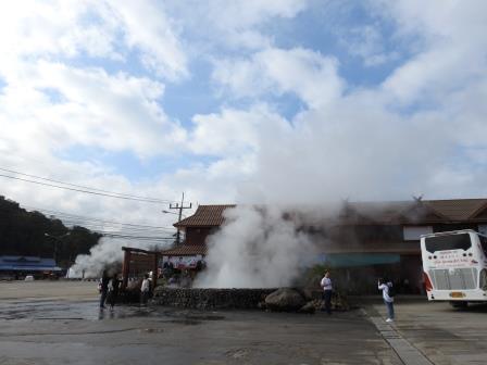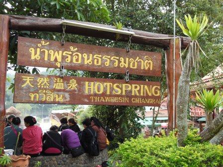Excursia a început cu o oprire de 30 de minute la izvoarele calde de la Thaweesin, Chiang Rai. A fost o oprire mai mult pentru a merge la baie decât pentru izvoarele în sine. Noi am fost atrași de micul templu părăsit de lângă izvoare: Wat Suwannaram Patong, dar cum vegetația era destul de mare și noi eram în sandale am zis că nu ne riscăm totuși să explorăm în voie că cine știe ce minuni se ascund prin iarbă. La intrarea la izvoare este și un gheizer cu care toată lumea făcea poză. Ce am mai fi vrut să facem, dar nu era timp, este să fi stat cu picioarele în apa caldă ce curgea prin niște șanțuri amenajate cum am văzut că făceau niște localnici (sau poate alți turiști, dar de-ai locului?).
