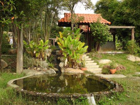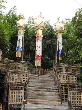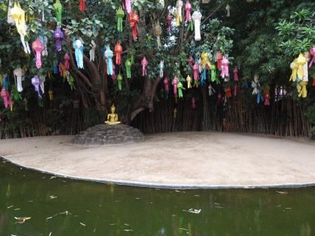 În partea stângă a templului se poate urca pe o cărare de bambus ce duce printre clopote și umbreluțe în spatele templului la un iaz ce delimitează o mică insuliță unde, sub un copac Bodhi, se găsește o statuie a lui Buddha.
