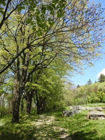 Această poieniță este su-per-bă 🥰. Te poți plimba printre ruine sau te poți așeza pe bancă să admiri salcâmii galbeni și arborii lui Iuda și bineînțeles stâncile superbe ce se înalță în fața ta 😍.