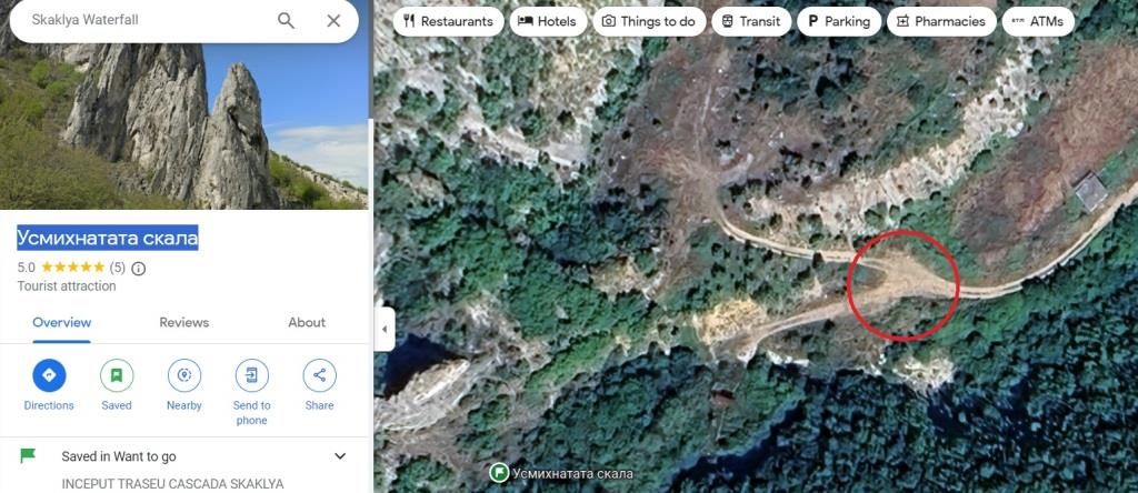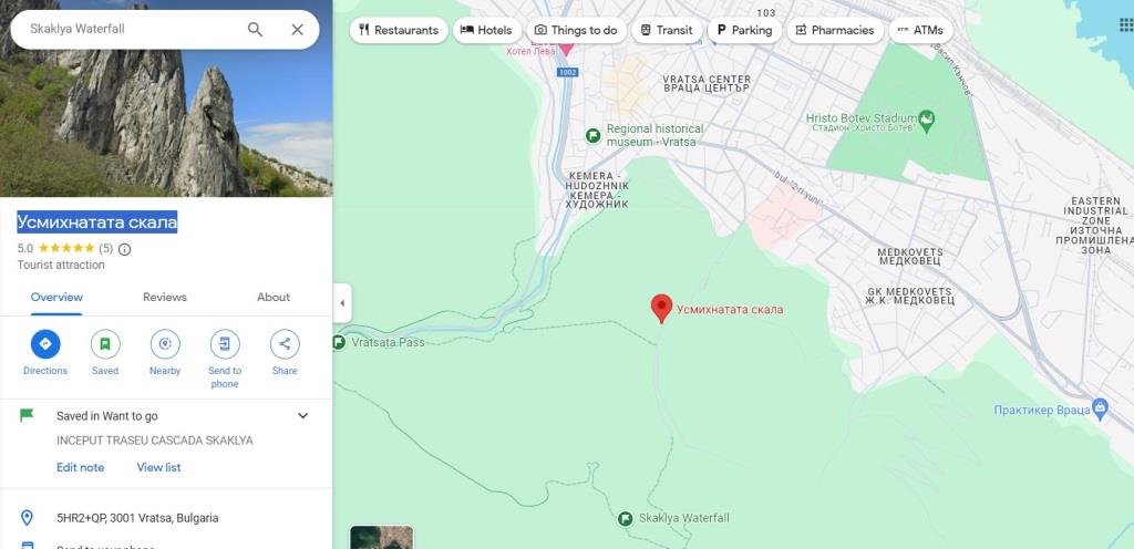 Începutul traseului spre cascadă se află la pin-ul “Усмихнатата скала” de pe GoogleMaps, în apropierea orașului Vratsa.