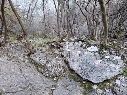 Din acest punct traseul devine destul de abrupt și este marcat cu o linie albastră când și când pe copaci sau pietre și cu bandă roșie. Marcajele sunt destul de șterse , iar la coborâre trebuie să ai mare grijă. Da, tot la vale vei merge, dar pe potecă este mai ușor decât să bâjbâi prin pădure 😊.