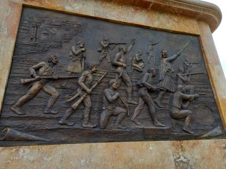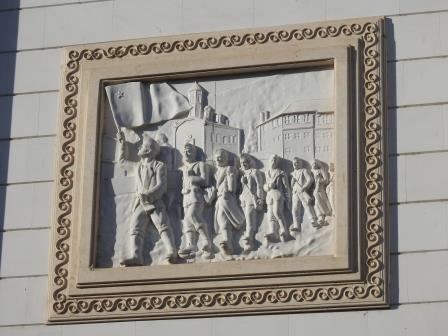 Sculptura are o înălțime de 14.5m și este așezată pe un stâlp de beton de 10m înălțime. Pe stâlpul de beton se află reprezentate 3 scene de bătălie despărțite de inele de bronz cu motive florale. La baza stâlpului, de jur împrejur, se află statuile a 8 soldați. Acești 8 soldați au o înălțime de 3m și sunt reprezentați în diverse ipostaze de luptă. La baza monumentului se află o fântână (pe care noi nu am văzut-o funcționând în decembrie că deh… era iarnă) la marginea căreia se află 8 lei de 2.5m înălțime.