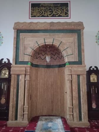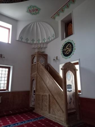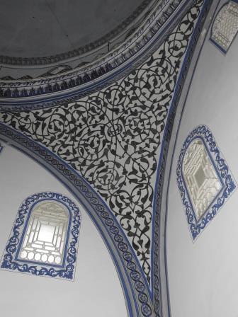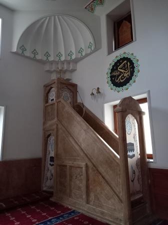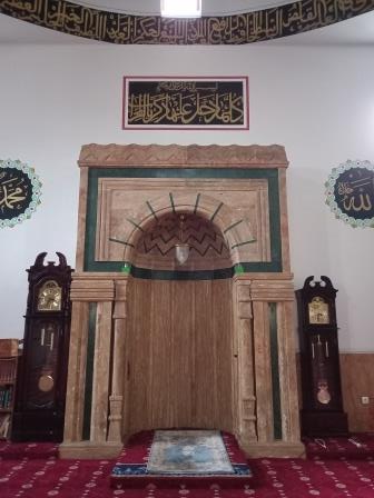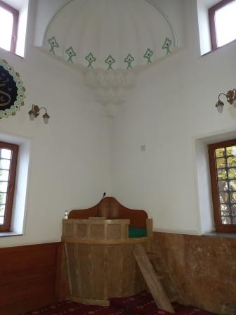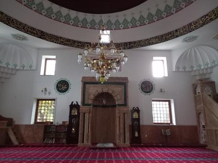 Interiorul moscheii este simplu și frumos. Pot fi observate arabescuri pe pereți și în jurul ferestrelor în nuanțe liniștitoare de albastru. Și covorul de pe jos este de un albastru foarte plăcut. Mihrabul (=altar într-o moschee, de forma unei nișe, bogat ornamentat și orientat spre Mecca) este realizat din marmură albă și este frumos ornamentat. În dreapta mihrabului se află minbarul (=amvon dintr-o moschee, în care se urcă imamul pentru a oferi predici).