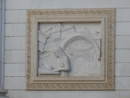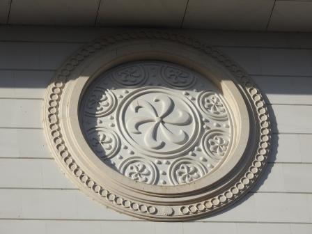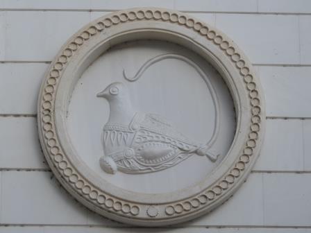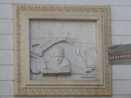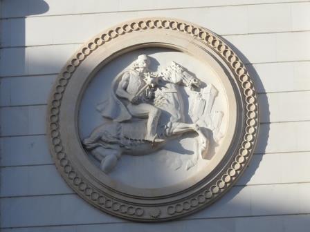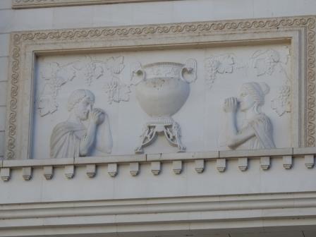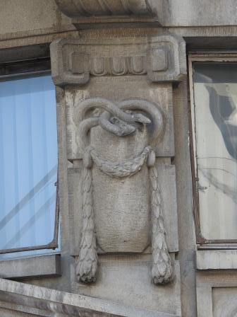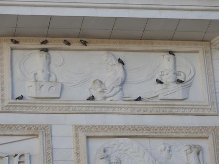Pe clădire sunt reprezentate figurile lui Aesculapius (preluat din greacă – Asclepios) zeul medicinei în mitologia romană și ale Higiei, zeița sănătății și curățeniei în mitologia greacă (fiice lui Aesculapius). Cele două zeități au fost realizate de către decoratorul Danilo Stojkovic (Данило Стојковиќ).