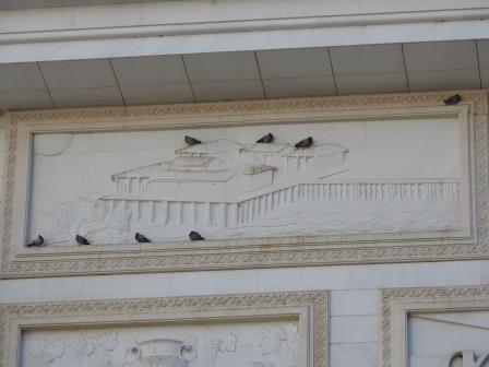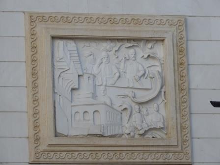 Ne mutăm privirea spre dreapta, la Monumentul de marmură al celui denumit prim președinte macedonean Metodija Andonov-Cento (macedoneană: Споменик Методија Андонов – Ченто; eng: Monument to Metodija Andonov – Čento).