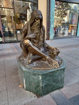 În fața magazinului de ceasuri este și Statuia Cerșetorului (macedoneană: Скултура Просјак; eng: Statue Beggar). Statuia a fost instalată în anul 2009 și este realizată din bronz de către Natasha Bojarova – Pianmanova. Conform autoarei, sculptura reprezintă martiriul creștin și a fost concepută pe baza canonului creștin care proiectează spațiul interior al rugăciunii și al tăcerii. Într-adevăr, dacă nu cunoști simbolismul statuii, te întrebi ce caută chestia aia acolo. Chiar și eu am gândit la fel până am aflat ce vrea să simbolizeze. Poate simbolizarea nu este chiar fericită pentru că nu te gândești absolut deloc la creștinism.