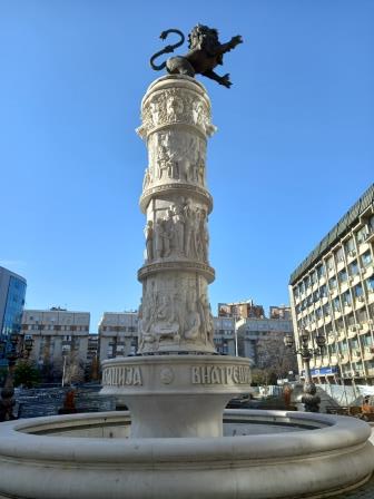 Ieșim în Piața VMRO (macedoneană: Плоштад ВМРО 1893; eng: VMRO Square) în mijlocul căreia se află o fântână cu un stâlp înalt în vârful căruia se află un leu, opera sculptoriței Elena Dukovska. Pe stâlpul fântânii sunt sculptate motive din istoria VMRO (Organizația revoluționară macedoneană internă). VMRO a existat în perioada 1919-1934, iar principalul scop al organizației era obținerea autonomiei Macedoniei și crearea unui stat macedonean independent.