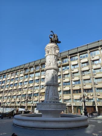 În prezent, în centrul pieței tronează Statuia “Războinic călare” (macedoneană: Воин на коњ; eng: Warrior on Horse) care nu este Alexandru Macedon, ca să nu se supere grecii. Nope. Sigur nu e Alexandru Macedon. E doar o impresie 🤣. Pe GoogleMaps găsești statuia ca Споменик „Александар III Македонски în macedoneană și Monument to Alexander III of Macedonia în engleză.