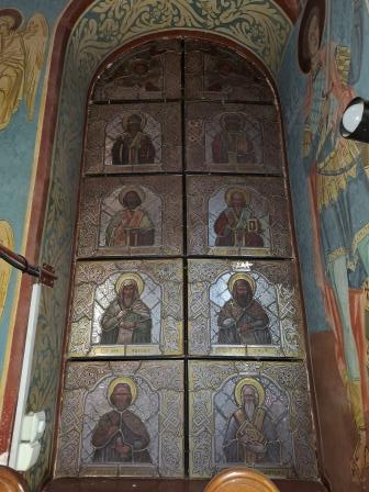 La interiorul bisericii pot fi observate și vitralii cu diferiți sfinți reprezentatți pe ele (Sf. Grigorie decapolitul, Sf. Cuvios Sava, Af. Cuvios Pahomie etc.).