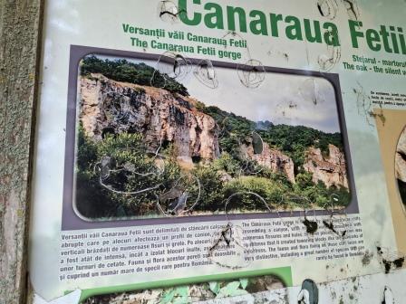Drumul se continuă prin pădure și pe lângă versanții văii Canaraua Fetii. Am văzut și două panouri informative destul de șterse și mascate de vegetație.