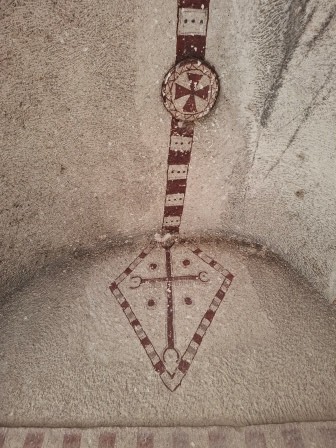 Din biserică se intră în sala principală ce prezintă o boltă semicilindrică și pilaștri încastrați în pereți. Intrarea principală se află pe peretele nordic, două uși mai mici fiind adăugate ulterior. Picturile de pe peretele vestic au fost deteriorate de infiltrațiile de apă, iar pe peretele estic poate fi observată o cruce cu colțuri în semilună încadrată într-un romb. Pe peretele sudic se observă o cruce deasupra brațelor căreia se observă literele “IC XC” (= Iisus Hristos).