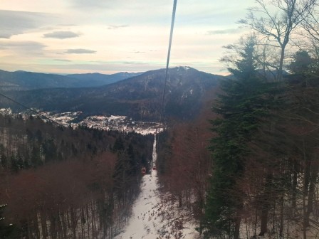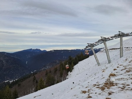 Deși planul inițial era să coborâm în Azuga pe același traseu, folosind fărașele, oboseala acumulată de Victor și Andrei după urcare ne-a făcut să schimbăm planul și să alegem coborârea cu telegondola 🚠🤍.
