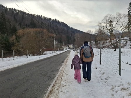 Dorința copiilor de a se plimba și a se juca în zăpadă, ne-a adus, în plină iarnă, pe traseul spre Popasul Uriașilor. Coborârea, inițial gândită pe același drum folosind fărașele, a fost făcută în cele din urmă cu telegondola.